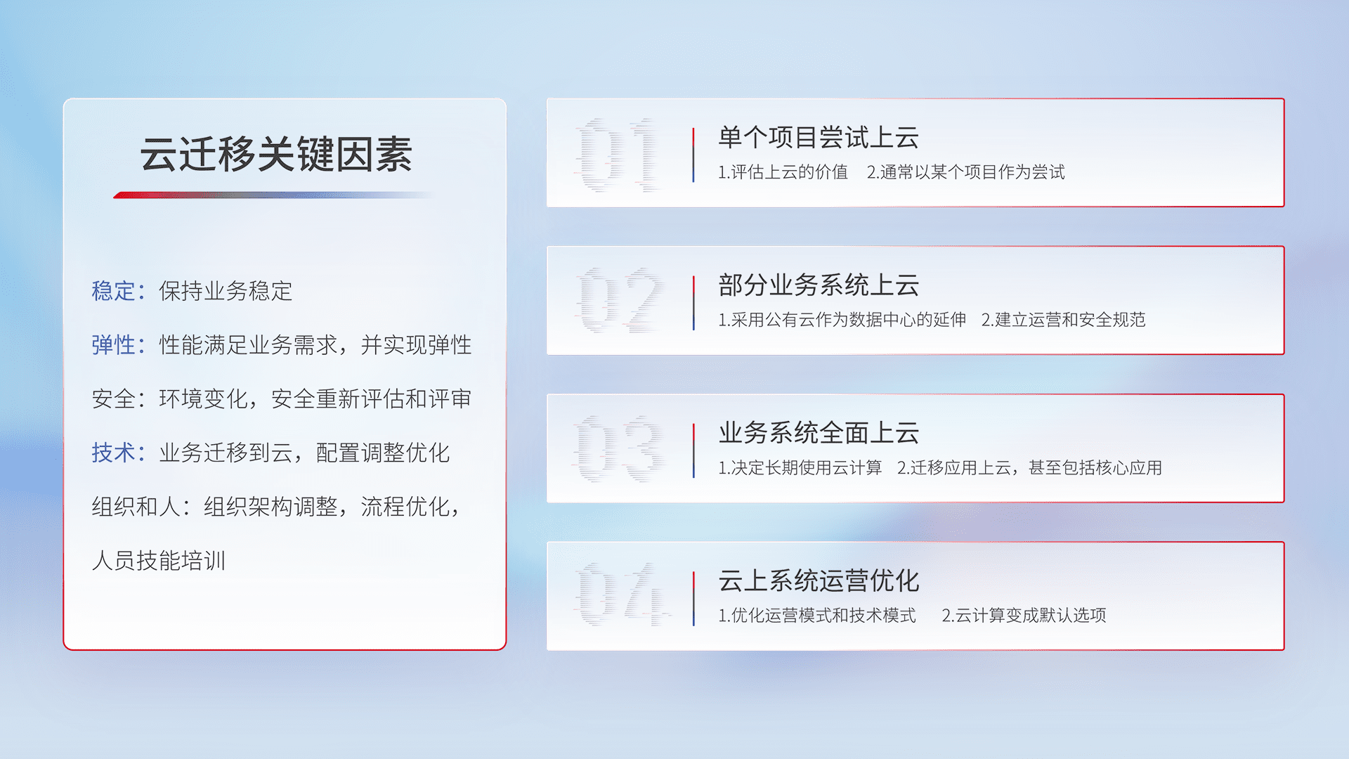 结合实际业务,,,从规划设计、、云平台选型、、、、云原生改造、、、、数据迁移、、、、集成交付,,迁移全过程为客户识别最佳上云路径,,做好风险识别管理,,,,设计网络架构、、身份权限、、、安全审计合规、、、、操作审计、、、、日志审计、、监控告警策略、、、多站点容灾设计等,,对云上基础设施进行整体规划,,提升IT治理水平,,,,以满足弹性、、、高可用、、、高性能的需求。。